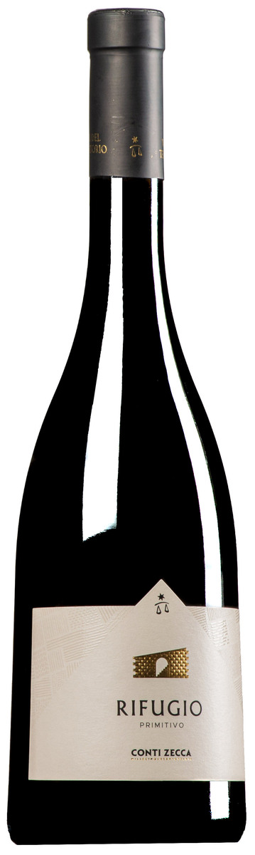 The name Rifugio – refuge – tells of underground hiding places where the inhabitants of Salento once protected themselves from danger. Today, an entire area near Veglie bears this name, where particularly high-quality Primitivo grapes thrive on alluvial, clayey soils with limestone deposits. The traditional Conti Zecca winery, owned by the noble family since the 16th century and one of the icons of Apulia with 320 hectares of vineyards, vinifies this single-varietal Primitivo using tried and tested methods: manual harvesting with selection at the sorting table, gentle destemming and pressing, twelve-day maceration at 25 degrees, alcoholic and malolactic fermentation in stainless steel tanks. Maturation takes place over twelve months in large oak barrels of 30 hectolitres and in resin-sealed concrete tanks, followed by a short period of maturation in the bottle.