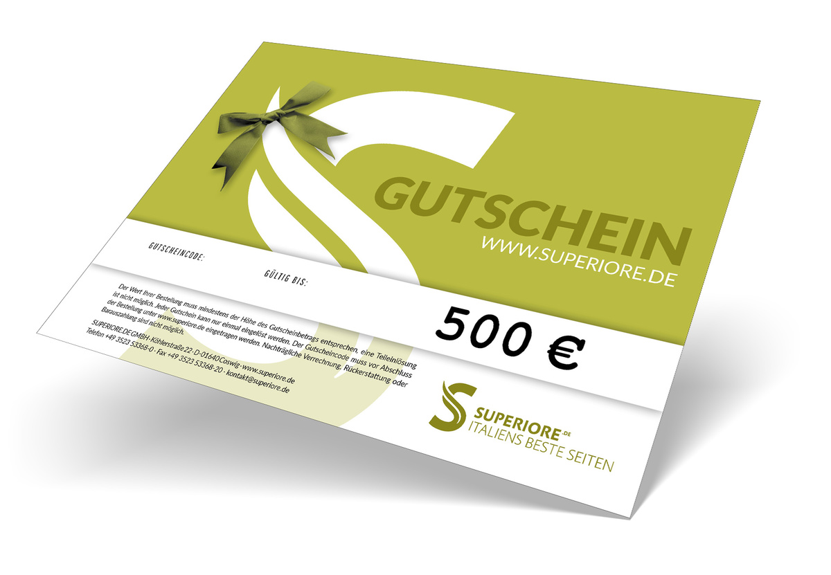 Vous souhaitez faire plaisir à vos proches parmi notre vaste assortiment, mais vous n'êtes pas sûr de votre choix ? Avec notre chèque-cadeau numérique d'une valeur de 500 €, vous offrez de la joie et du plaisir à l'état pur. Le chèque-cadeau pdf vous parvient directement par e-mail (dans les 4 heures) sans délai de livraison postal et peut être imprimé immédiatement. Le bon pdf personnalisé est valable sur l'ensemble de la gamme SUPERIORE.FR et est également idéal comme cadeau de dernière minute. Faites preuve de goût et offrez un plaisir gourmand ! SUPERIORE.DE