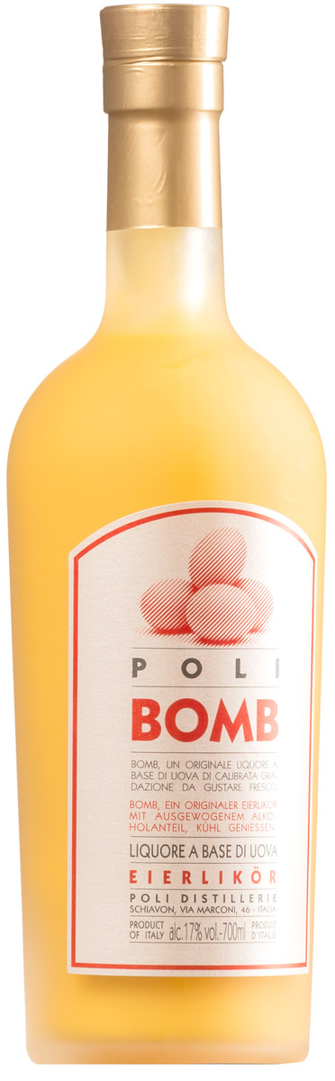 En 1898, l'arrière-grand-père Titta montait un alambic sur une charrette à bras et allait de maison en maison pour distiller le marc. Quatre générations plus tard, Jacopo Poli dirige l'empire familial à Schiavon, près de Bassano del Grappa – avec cinq installations de distillation discontinues, dont les chaudières en cuivre originales de 1956. Bomb suit une recette traditionnelle de Bassano : jaune d'œuf frais, lait frais, sucre et le symbole de la région – la grappa. Le résultat est une "bombe de crème" d'une densité envoûtante.