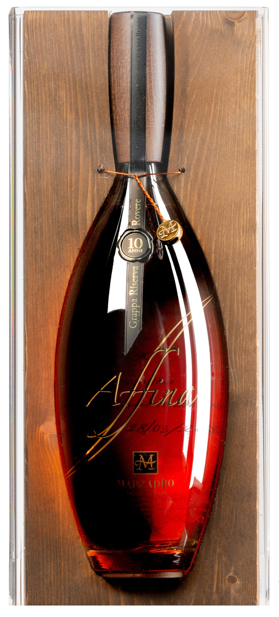 Affina Riserva Rovere est une sélection limitée qui a vieilli pendant huit ans dans de petits fûts de chêne de différentes origines. Cette combinaison unique d'arômes est présentée dans une bouteille soufflée en forme de goutte avec un bouchon en bois de chêne et dans une caisse en bois de chêne magnifiquement travaillée avec un couvercle en plexiglas.