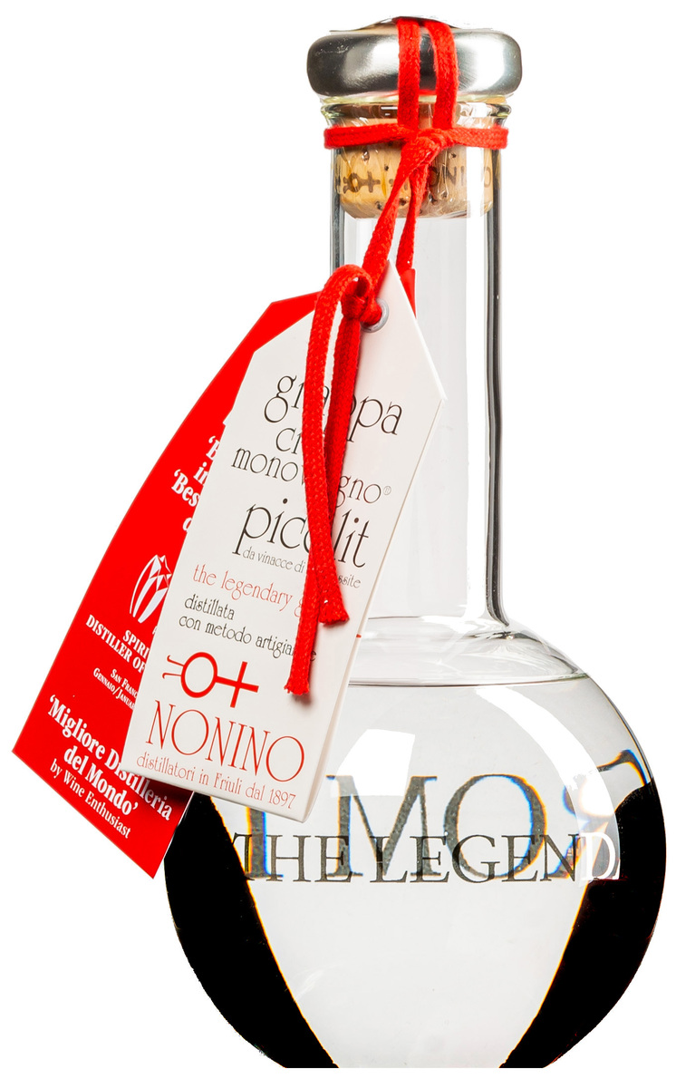 "Cette grappa monocépage élaborée à partir de raisins Picolit est limpide dans le verre et présente un arôme floral délicat. La bouche s'ouvre sur des zestes de citron, puis sur des fleurs blanches et une longue finale relevée de poivre blanc et d'un léger soupçon de cerise." Wine Enthusiast