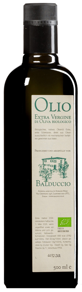 Et la qualité vraiment excellente du Balduccio-Extra Vergine n'est pas le fruit du hasard. Le terroir du Montalbano produit des olives aromatiques de grande qualité. Mais la transformation des qualités naturelles en une huile d'olive propre, fruitée et typique du terroir n'est possible que parce qu'Andreas März et ses fils se consacrent depuis des années à l'amélioration de la qualité de l'huile d'olive et mettent systématiquement leurs connaissances en pratique. Le parfum évoque discrètement des amandes vertes, mais aussi des artichauts et des olives vertes fraîches ; en bouche, grâce à la forte proportion de moraiolo, l'huile a un goût puissant et corsé, fruité en vert et en fait seulement discrètement amer ; le meilleur est à la fin : un piquant imposant, donné par les valeurs polyphénoliques extrêmement élevées de ce millésime. SUPERIORE.DE