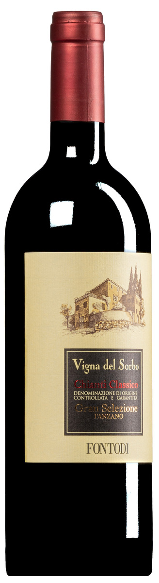 Juste devant la cantina, à 450 mètres d'altitude et orienté sud-ouest, se trouve le vignoble qui définit depuis 1985 les exigences de Fontodi en matière de sangiovese. Trois parcelles, plantées entre 1963 et 1973, réunies par une particularité géologique : des sols de galestro schisteux qui se brisent en surface en plaquettes caractéristiques. Giovanni Manetti s'est rendu compte très tôt que cette structure de sol conférait au sangiovese ce fruit sombre et ce volume en milieu de bouche qui le distinguent des terroirs à dominante calcaire. Le nom "Sorbo" fait référence à un fruit toscan local – sec, riche en tanins, presque comme le raisin lui-même. Ce qui a commencé comme une riserva en 1985 a été élevé au rang de Gran Selezione avec le millésime 2011, lorsque la nouvelle classification a été introduite dans le Chianti Classico. Depuis 2012, il est composé à 100% de sangiovese, auparavant assemblé avec de petites quantités de cabernet sauvignon.