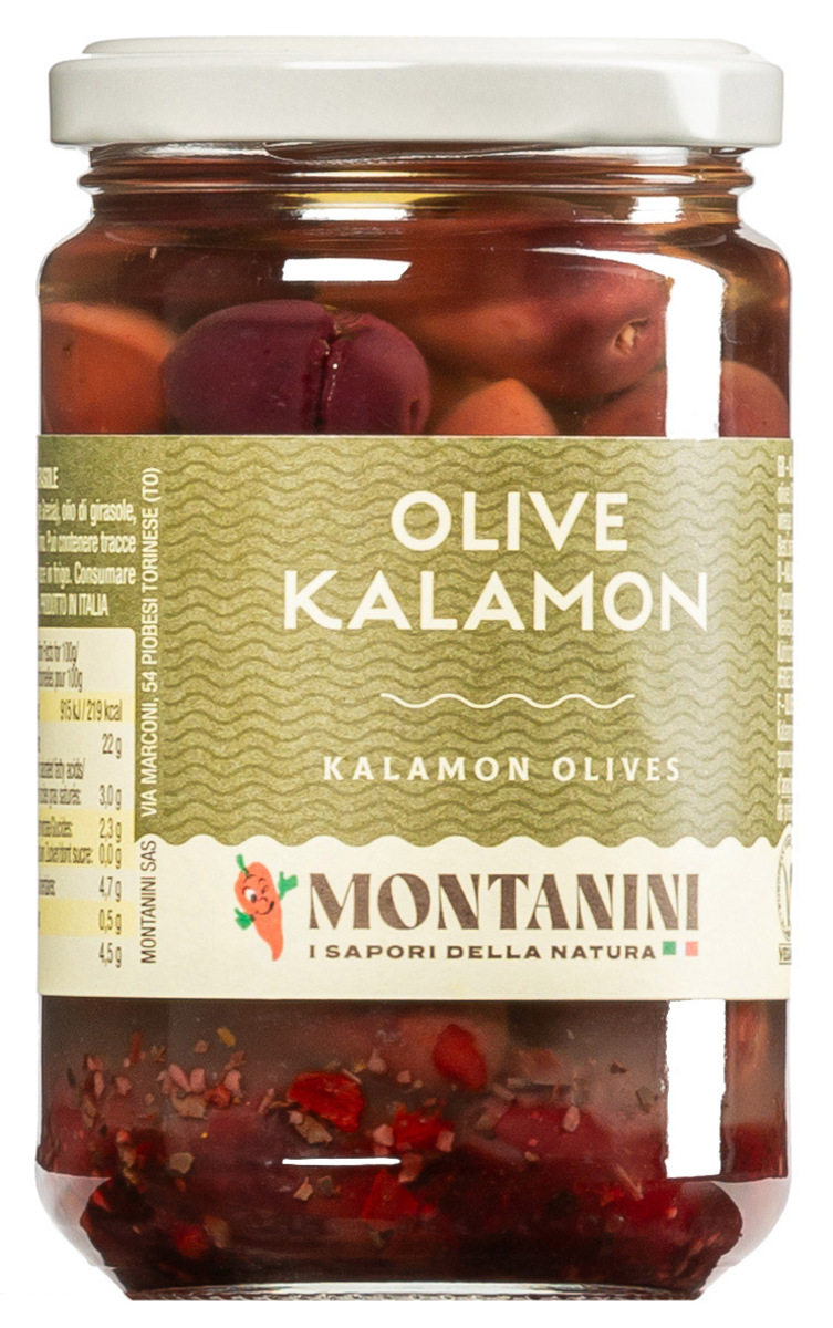 Olive Kalamata italiane, dalla consistenza soda e dal sapore tipico, conservate in olio di semi di girasole ed erbe aromatiche. SUPERIORE.DE