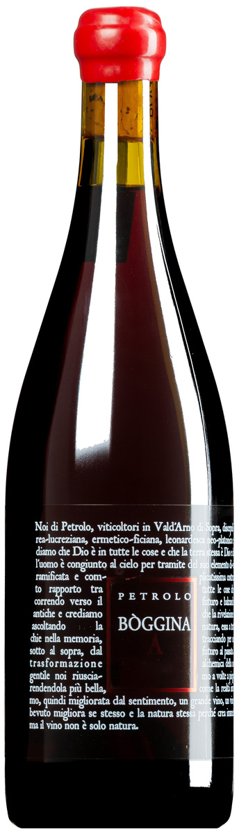 Era un sogno quello dell'ingegnere Gastone Bazzocchi che nel 1947 piantò nella terra toscana – cinque ettari di Sangiovese su una collina che chiamò Bòggina. Luca Sanjust, suo nipote ed ex pittore, pensa ora all'"Angelus Novus" di Paul Klee e all'interpretazione di Walter Benjamin di questo angelo che "guarda al passato" mentre "una tempesta soffia dal paradiso". Questa è Bòggina: un vino con lo sguardo rivolto al passato eppure spietatamente spinto verso il futuro. Dal 2011 Petrolo sperimenta la vinificazione di un lotto speciale delle migliori uve di questo vigneto storico in anfore di terracotta dell'Impruneta, la ceramica che ha caratterizzato la Toscana – la ceramica che caratterizza la cultura toscana fin dagli Etruschi. La fermentazione avviene per due settimane in anfore da 300 e 500 litri con lieviti indigeni, prima che i recipienti vengano chiusi ermeticamente. Il vino macera sulle bucce per otto mesi, protetto dal contatto naturale con le bucce senza l'aggiunta di solfiti.