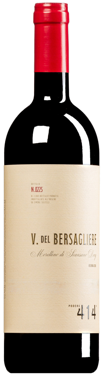 Sono state riempite solo 2.000 bottiglie numerate dell'annata di debutto 2018 del Morellino di Scansano Riserva "Vigna del Bersagliere". Le uve del nuovo Sangiovese di punta di Podere 414 provengono da un piccolo vigneto a coltivazione biologica di appena 1,3 ettari sopra la cantina. Viene invecchiato per 36 mesi in tonneaux da 500 litri e poi affinato per 24 mesi in bottiglia. Colore rosso rubino brillante. Aromi primari di frutta scura e matura con note speziate nel bicchiere. Al palato è strutturato in modo deciso, ancora frutta scura, più prugne e toni terrosi. È ancora giovane e un po' spigoloso nel bicchiere, ma il suo stile eccezionale e la buona struttura acida/tannica suggeriscono già un ottimo potenziale di invecchiamento. SUPERIORE.DE