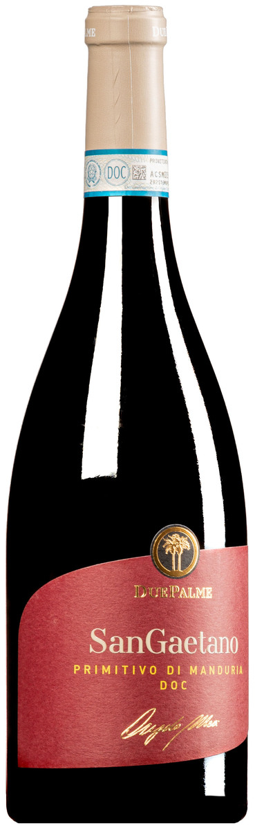 Der Name SanGaetano erzählt von der Genossenschaftstradition: 2012 übernahm Cantine Due Palme die kleine Cooperativa San Gaetano in Lizzano, um die Produktion von Primitivo di Manduria gezielt auszubauen. Diese DOC-Appellation gilt seit Langem als eine der bedeutendsten Rotwein-Denominationen Apuliens – geschätzt in Italien wie international. Die Primitivo-Reben wachsen auf den charakteristischen rotgefärbten Böden von Manduria, deren lehmig-kalkhaltige Struktur reich an Mineralien und Eisenoxiden ist. Diese Böden mit ihrem felsigen Kalksteinuntergrund prägen den Charakter des Weins entscheidend. Die Trauben werden Ende August, Anfang September bei leichter Überreife von Hand in kleinen Kisten gelesen, um höchste Qualität zu garantieren. Nach temperaturkontrollierter Vergärung reift der SanGaetano sechs Monate in amerikanischen Eichenfässern – eine Reifung, die die Tannine verfeinert und dem Wein zusätzliche Komplexität verleiht.