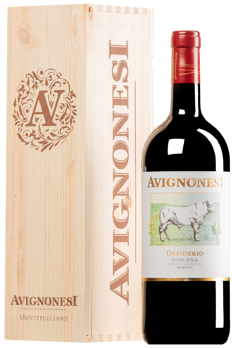 Vor mehr als hundert Jahren lebte auf der Capezzine-Farm von Avignonesi ein weißer Stier namens Desiderio. Er war der größte Stier der Toskana seiner Zeit – und mehr noch: Er gehört zu den anerkannten Urahnen der Chianina-Rasse, jener edlen Rinderrasse, aus der die Bistecca Fiorentina geschnitten wird. Wer heute ein T-Bone-Steak nach Florentiner Art genießt, trägt mit einiger Wahrscheinlichkeit ein wenig DNS von Desiderio auf dem Teller. Es kam daher wie von selbst, dass Avignonesi seinen kraftvollsten Rotwein nach ihm benannte. Das Etikett zeigt ihn – und verändert sich mit jedem Jahrgang. Himmel, Lichtstimmung, Details in der Darstellung erzählen vom Klima des Jahres: ob heiß oder kühl, trocken oder balanciert. Ein stiller Jahrgangskommentar in Bildform.
